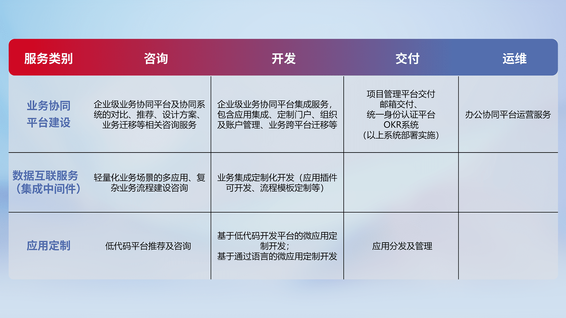 针对钉钉、、企微、、、IDaas等平台级产品提供产品的规划、、方案、、交付、、定制化开发等服务,,实现如统一协同办公、、、、智能客户服务、、、混合会议管理、、、智能数据查询、、、、等业务场景,,,实现数字化转型。。。